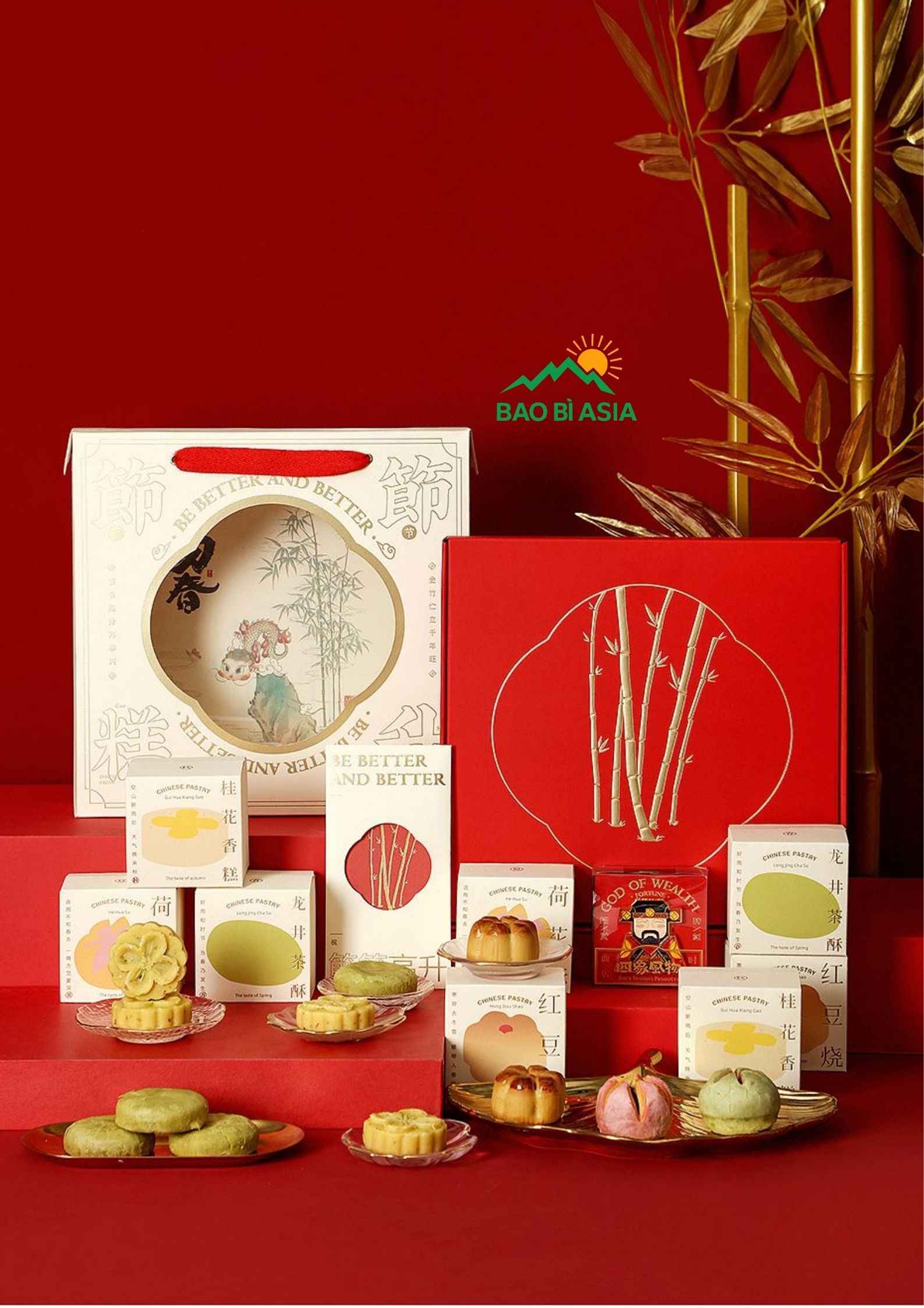 - Phong cách truyền thống: Tông đỏ kết hợp họa tiết tre mang ý nghĩa may mắn, trường thọ và thịnh vượng, rất phù hợp làm quà biếu.