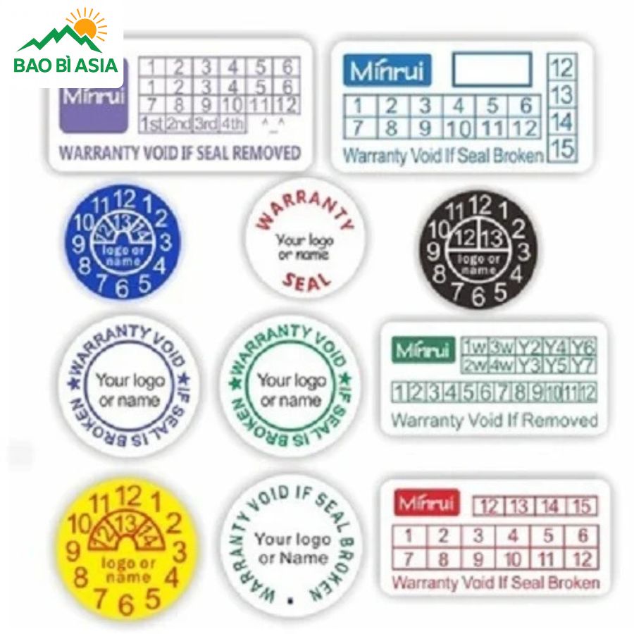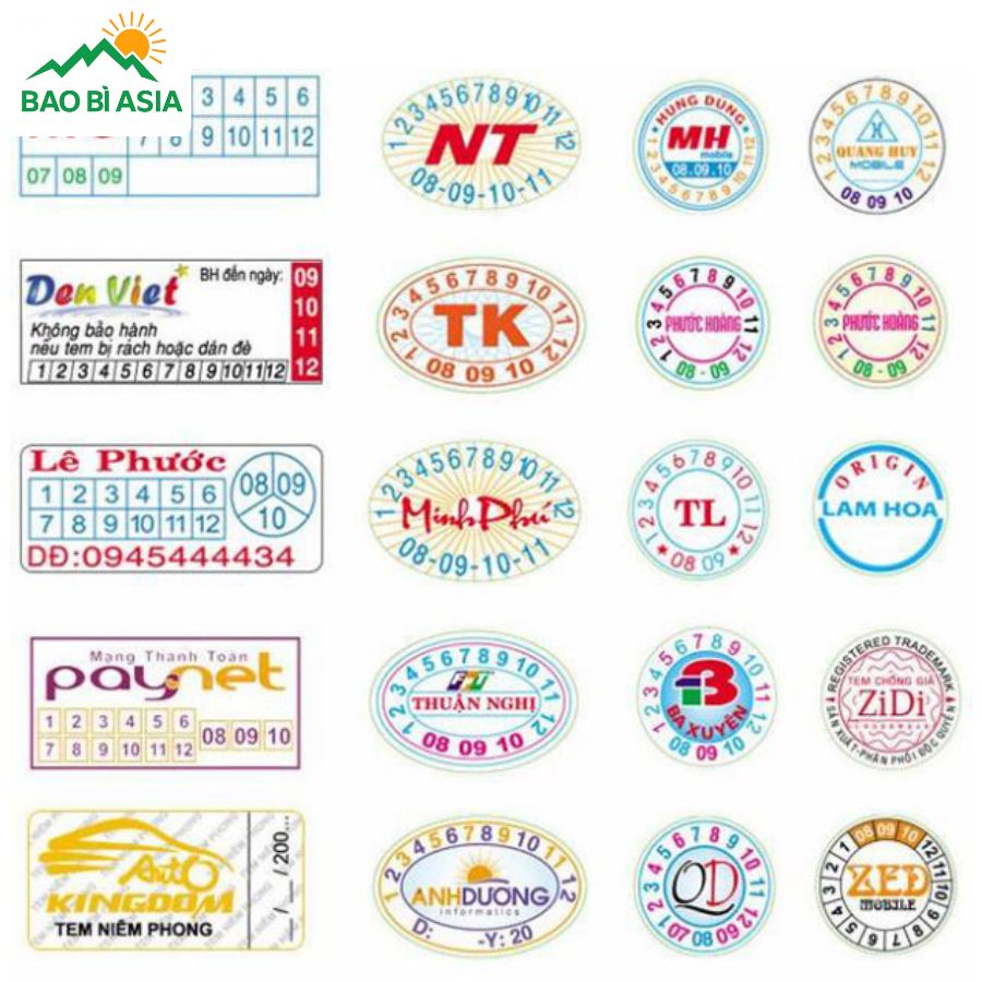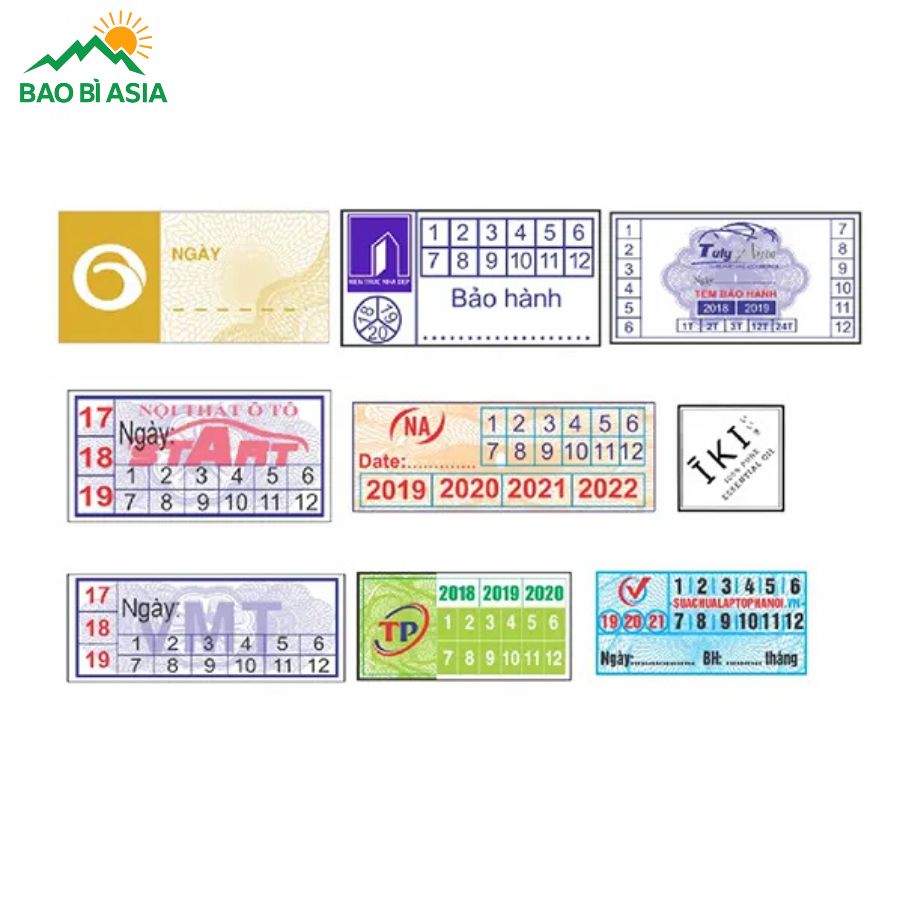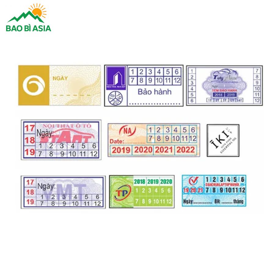 Việc lựa chọn đúng hình dạng và kích thước tem không chỉ đảm bảo tính thẩm mỹ mà còn nâng cao hiệu quả bảo hành của sản phẩm. Một số kích thước, hình dạng tem phổ biến mà Bao Bì Asia thường xuyên nhận yêu cầu in ấn có thể kể đến như: