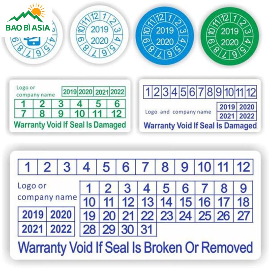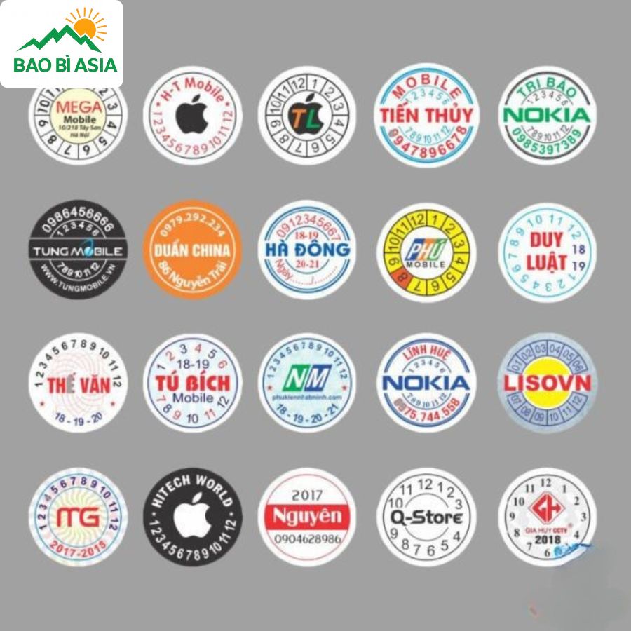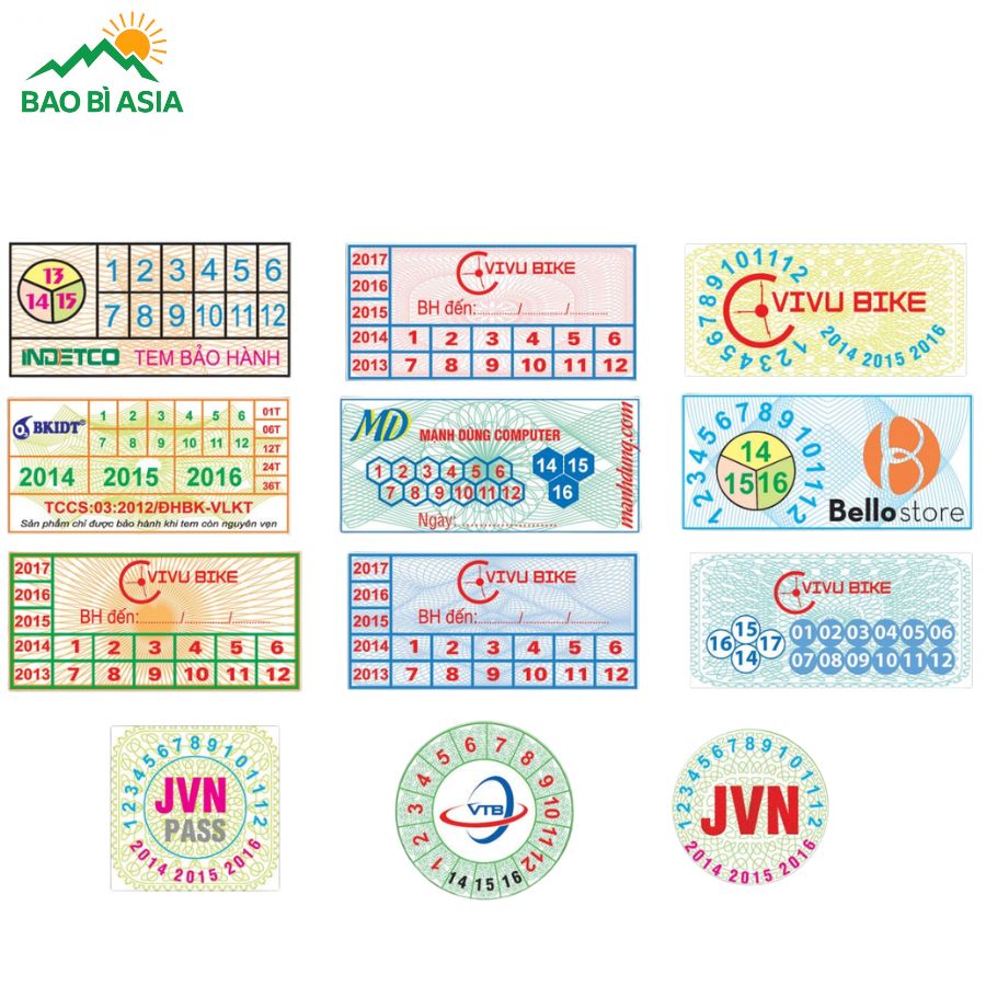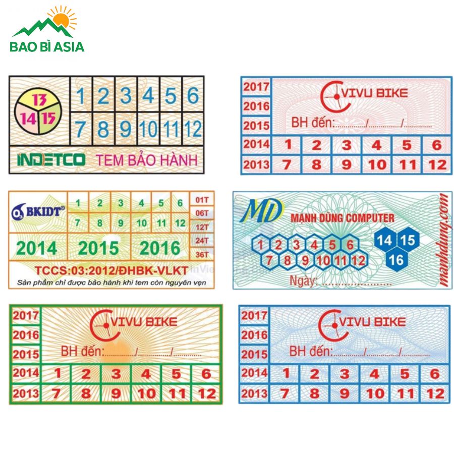 Việc lựa chọn đúng hình dạng và kích thước tem không chỉ đảm bảo tính thẩm mỹ mà còn nâng cao hiệu quả bảo hành của sản phẩm. Một số kích thước, hình dạng tem phổ biến mà Bao Bì Asia thường xuyên nhận yêu cầu in ấn có thể kể đến như: