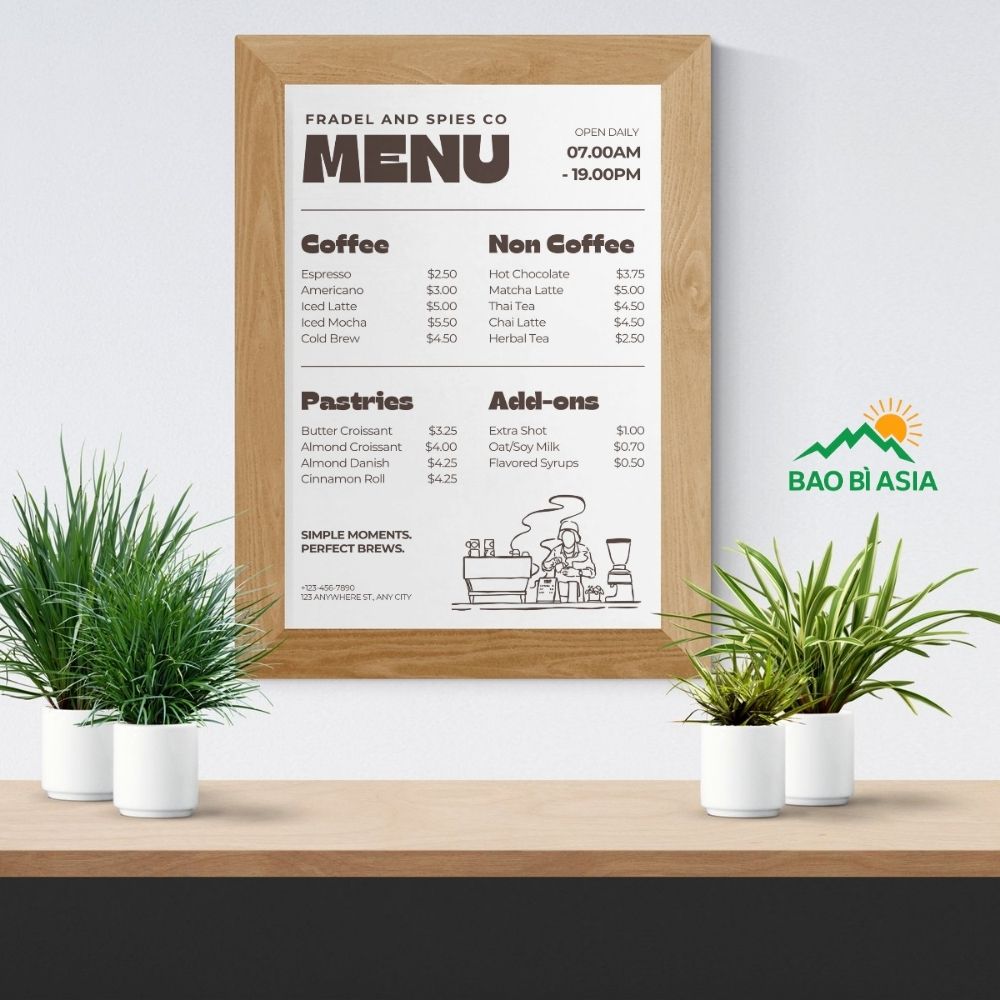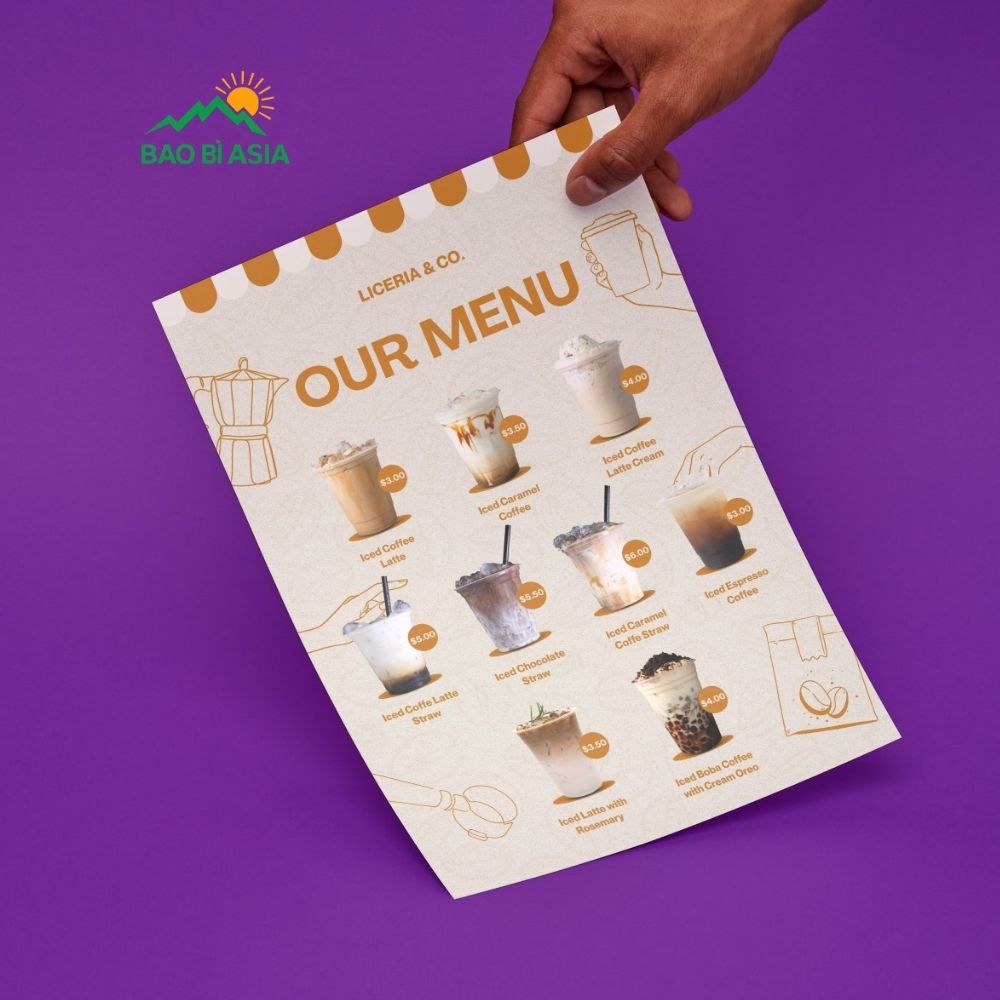 Một menu cà phê được thiết kế chỉn chu sẽ giúp quán tạo ấn tượng chuyên nghiệp và nâng cao trải nghiệm khách hàng ngay từ lần đầu ghé thăm. Hy vọng hơn 100+ mẫu menu đẹp, đơn giản trong bài viết đã mang đến cho bạn nhiều ý tưởng phù hợp với phong cách quán của mình. Nếu bạn cần thiết kế và in ấn menu, tem nhãn nhanh chóng, chất lượng, đừng ngần ngại liên hệ Bao Bì Asia để được hỗ trợ tốt nhất.