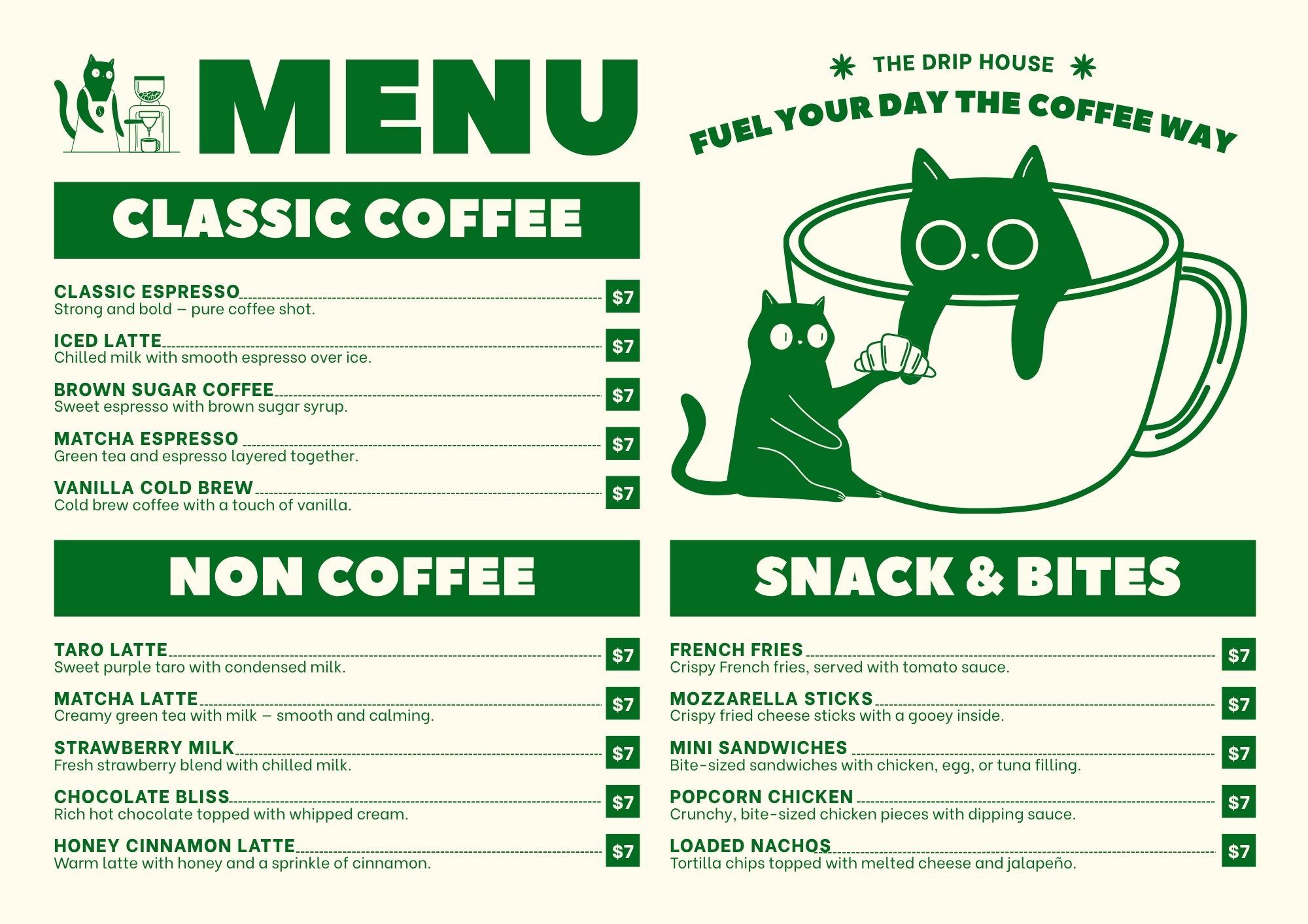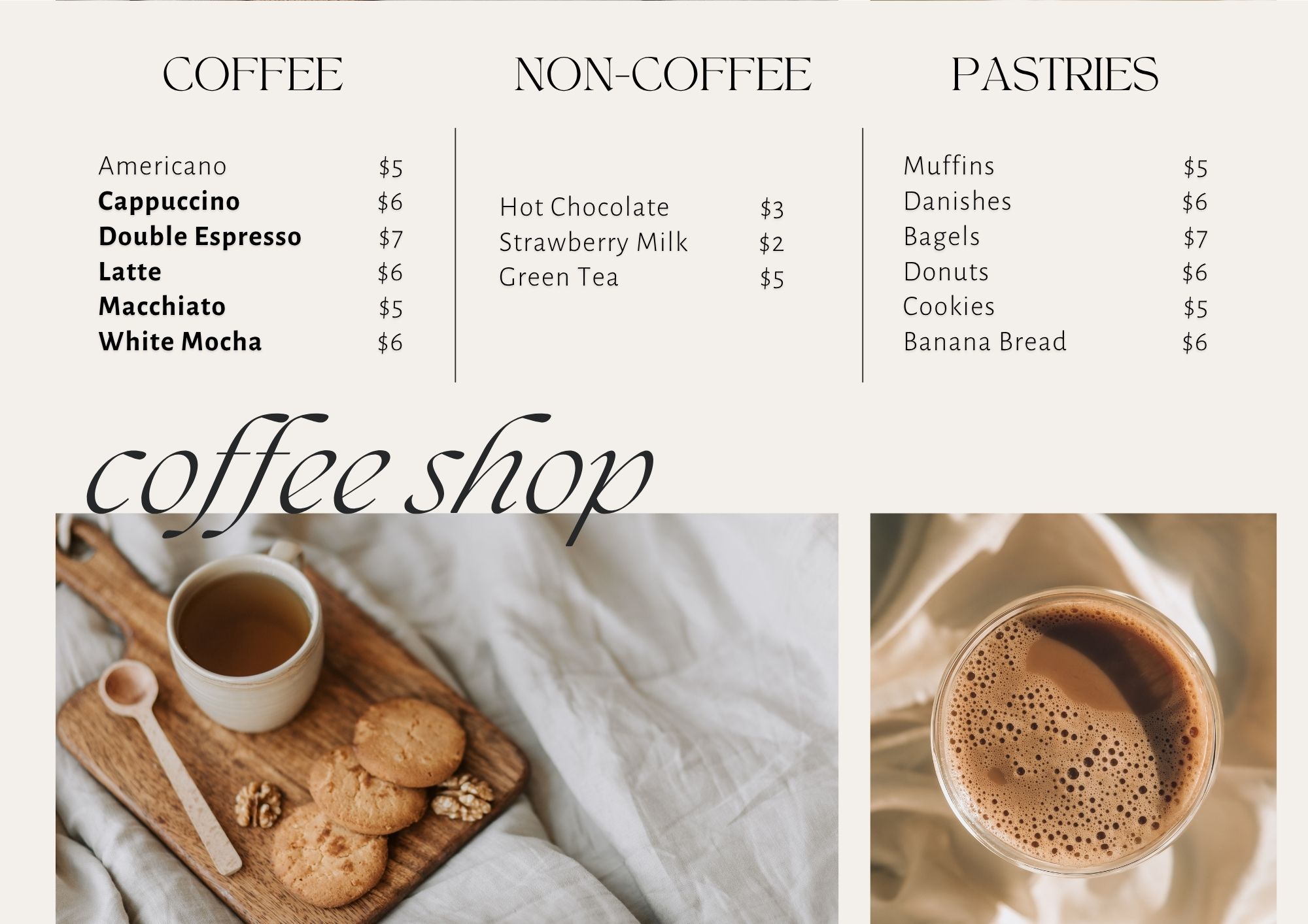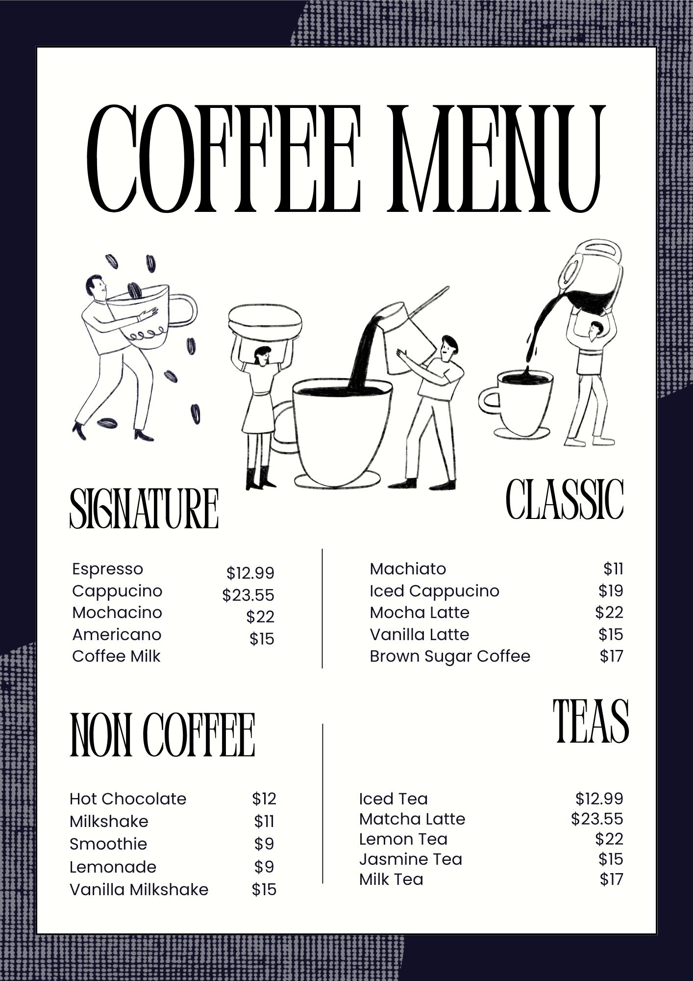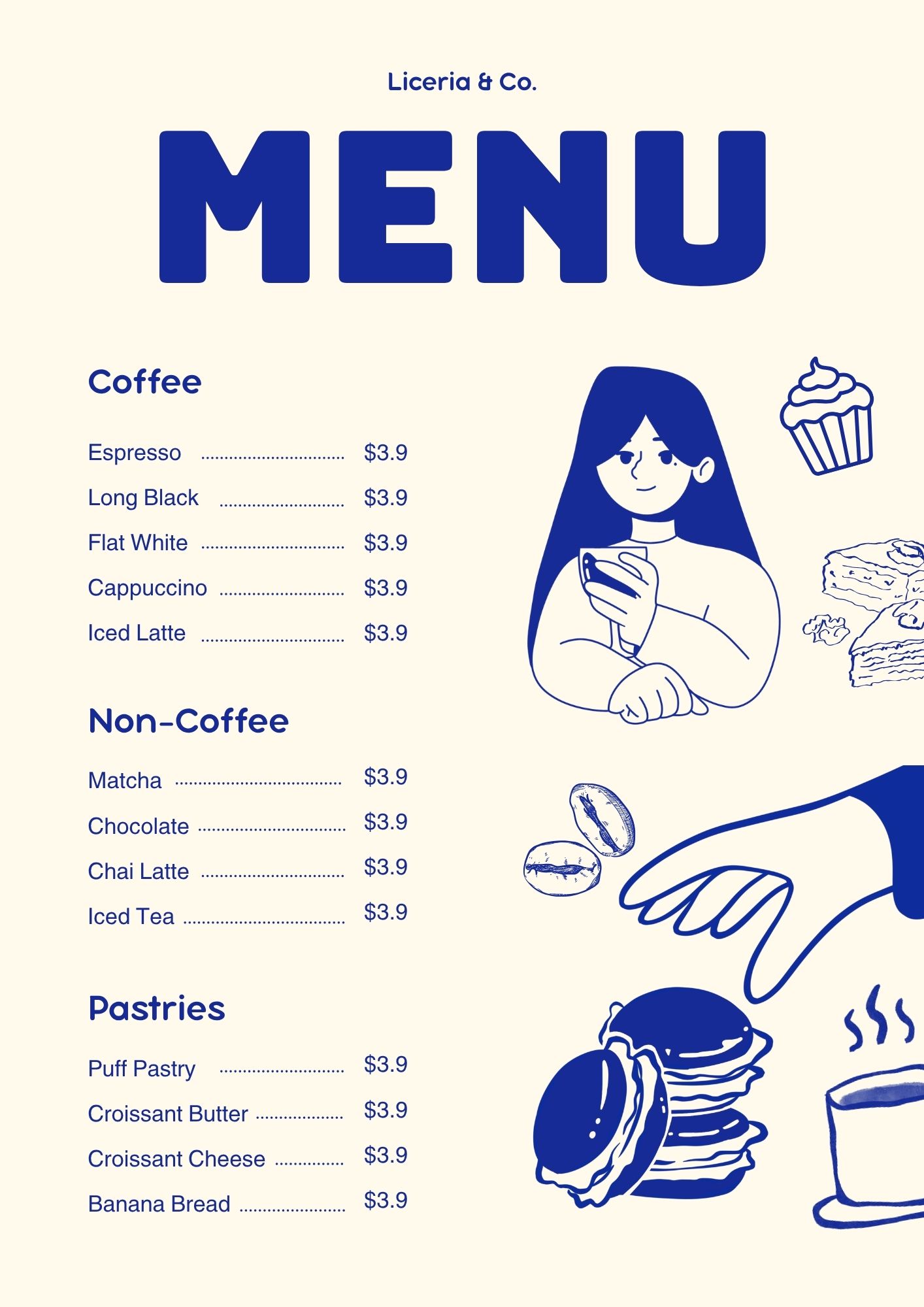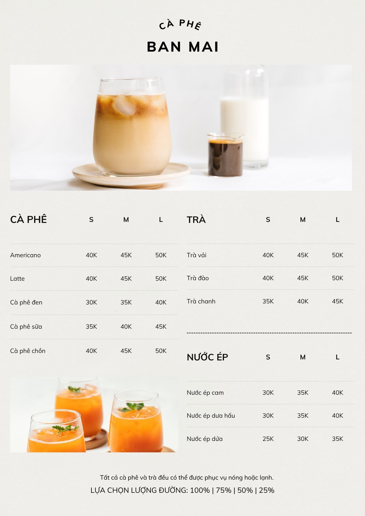 - Bố cục và nội dung rõ ràng: Menu nên được chia thành từng nhóm đồ uống như cà phê, trà, nước ép… với tiêu đề nổi bật. Tên món và giá cần đặt gần nhau, dễ nhìn để khách có thể lựa chọn nhanh mà không phải tìm kiếm lâu.