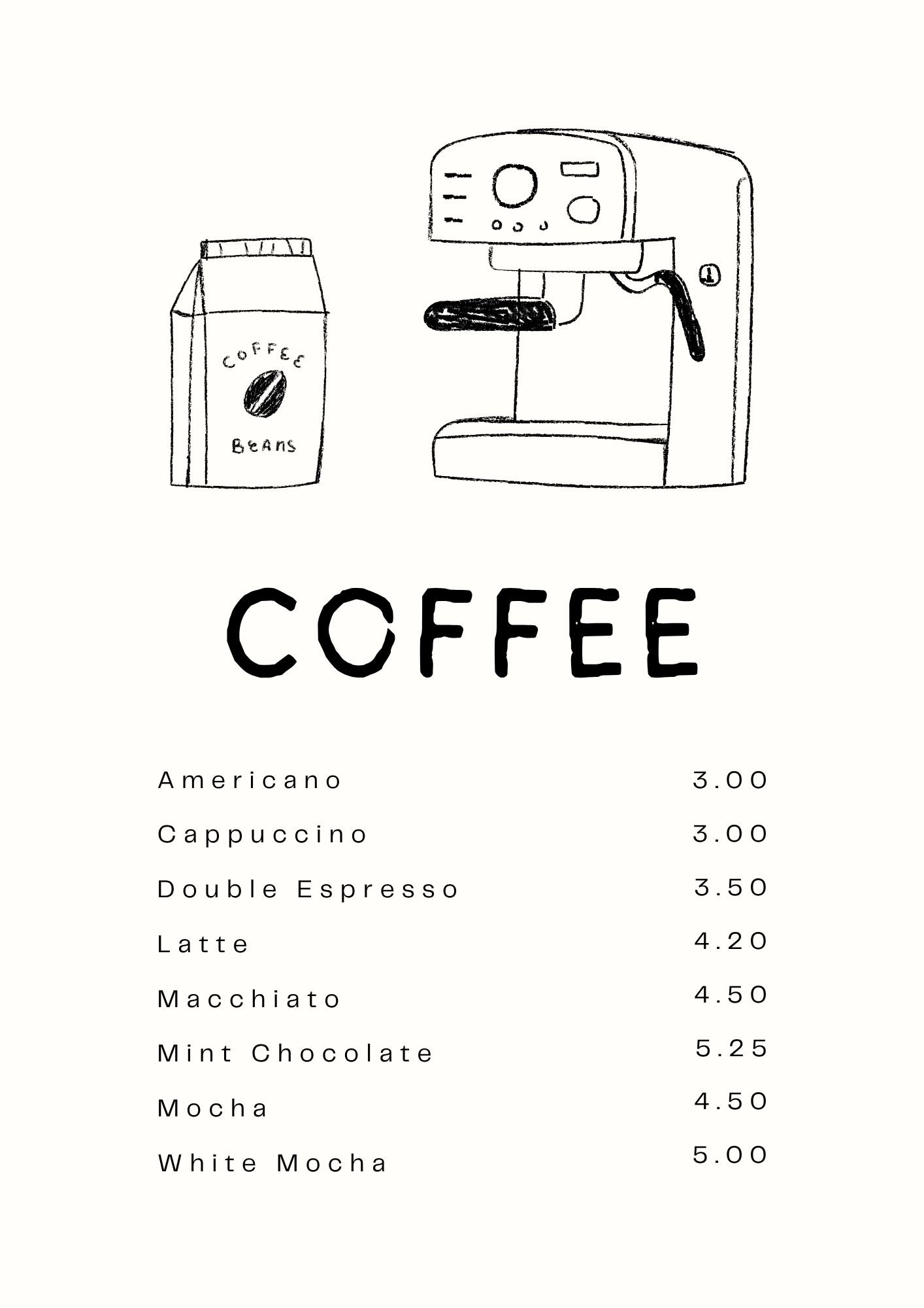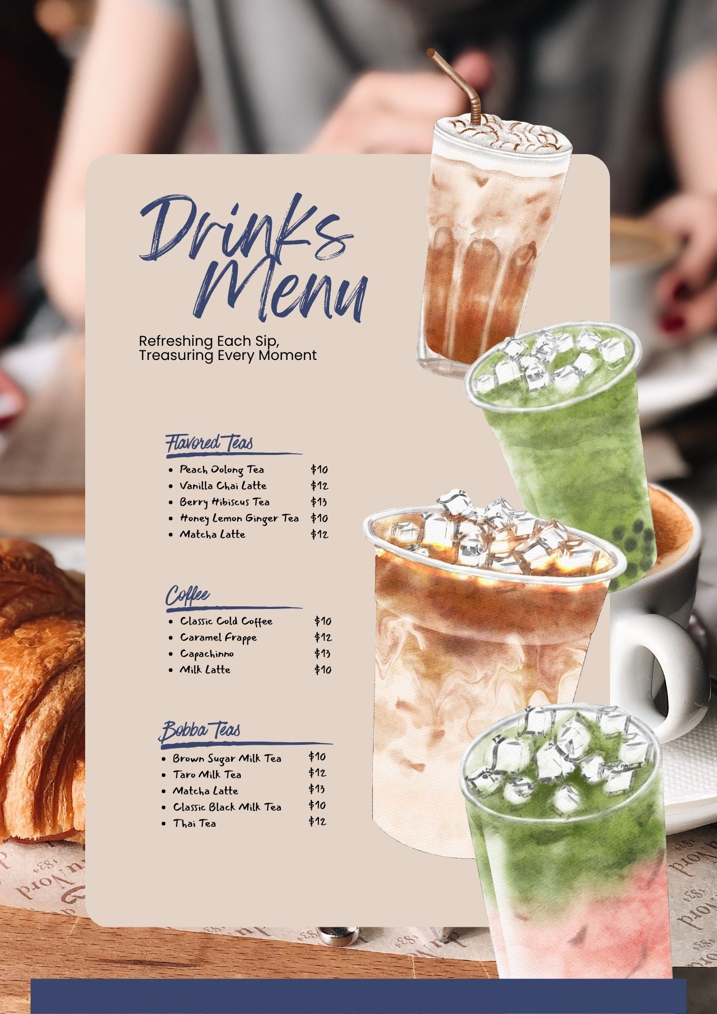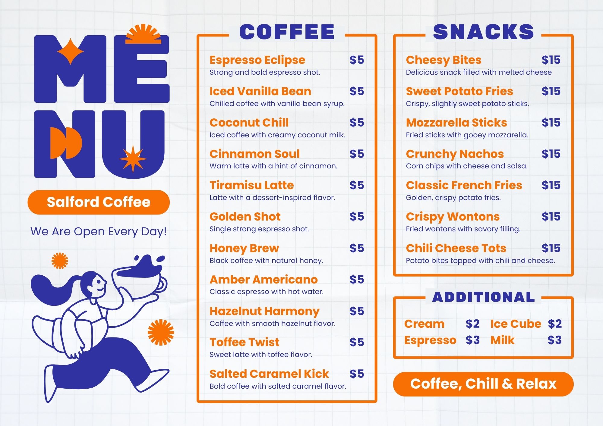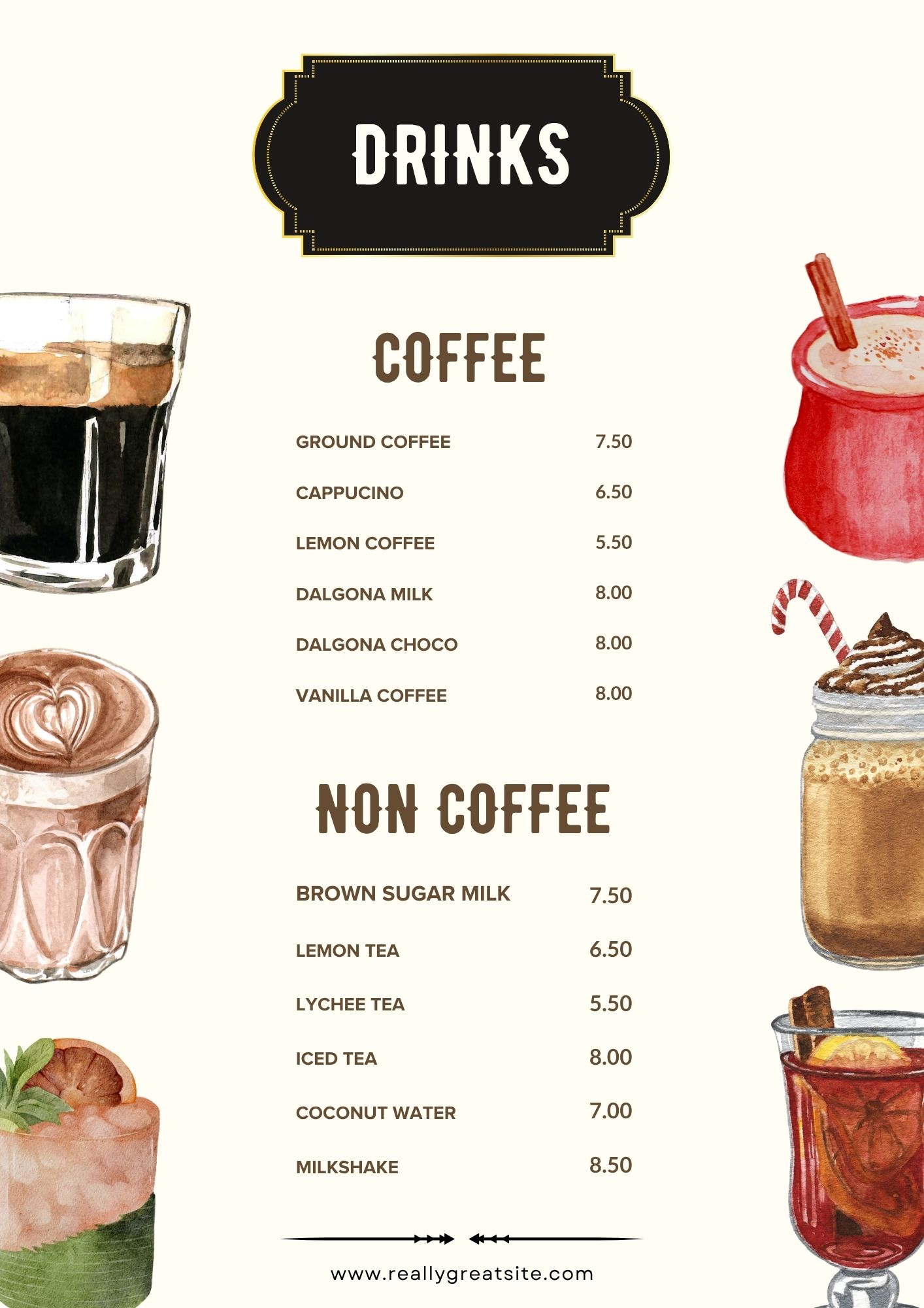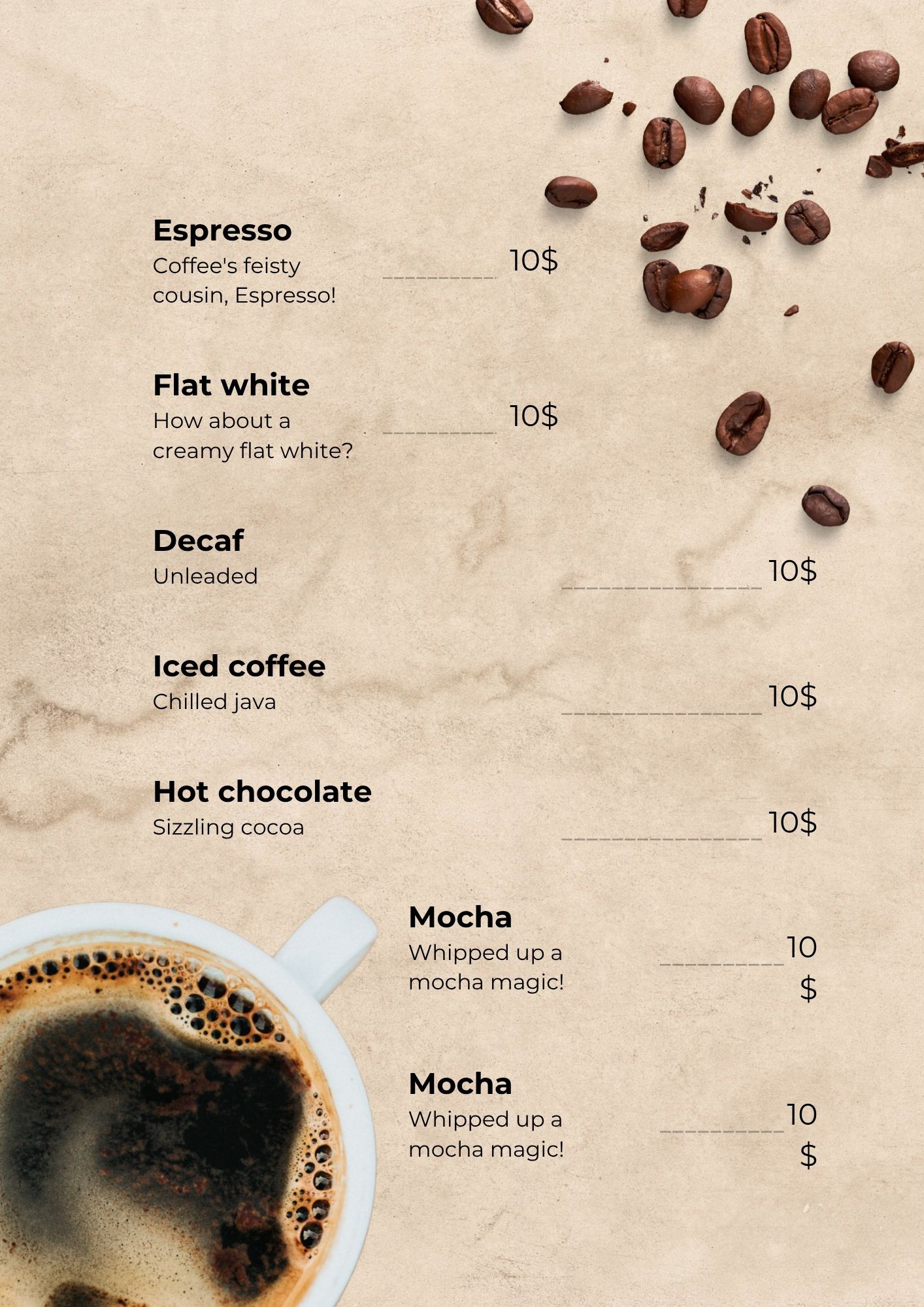 - Bố cục và nội dung rõ ràng: Menu nên được chia thành từng nhóm đồ uống như cà phê, trà, nước ép… với tiêu đề nổi bật. Tên món và giá cần đặt gần nhau, dễ nhìn để khách có thể lựa chọn nhanh mà không phải tìm kiếm lâu.