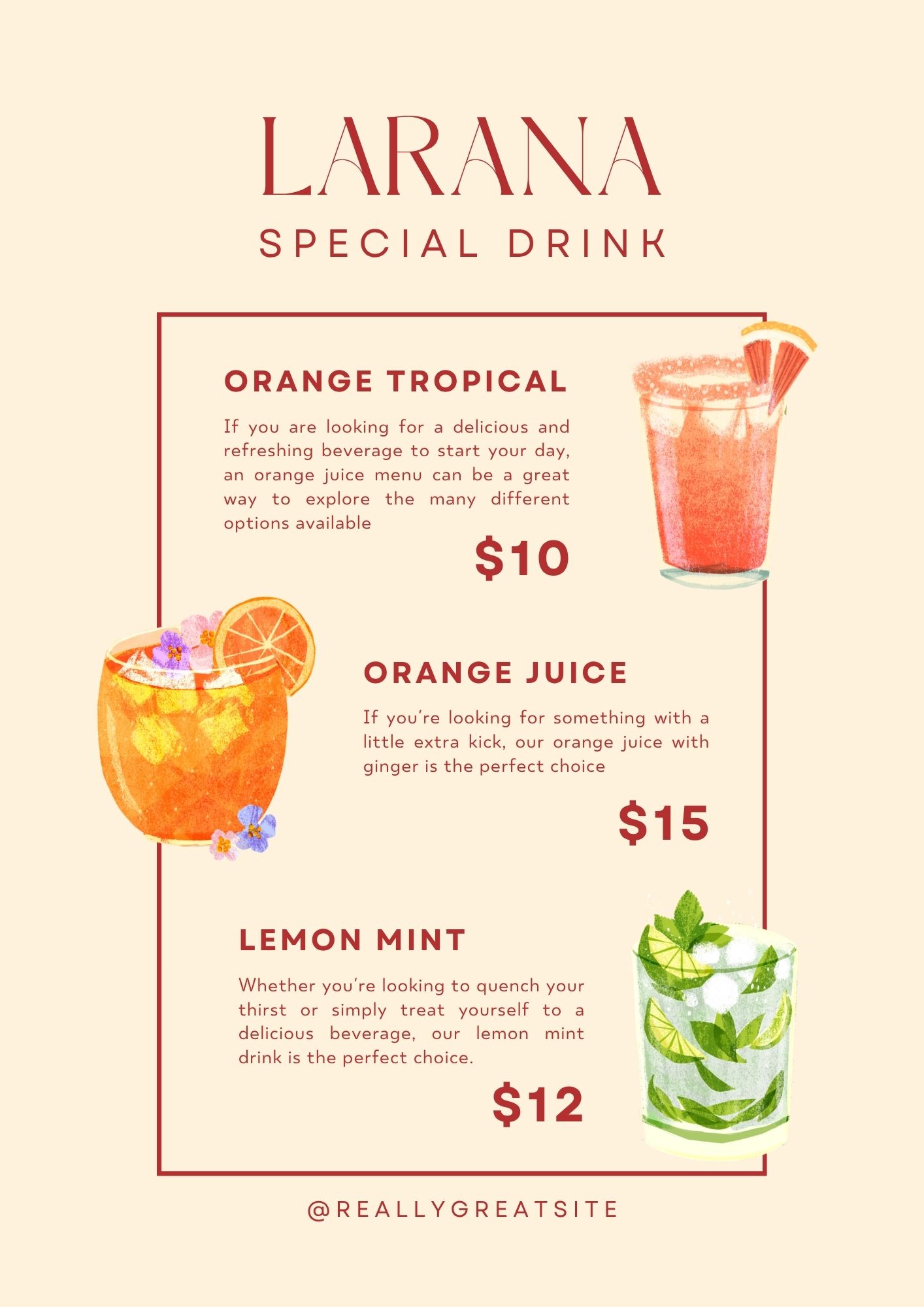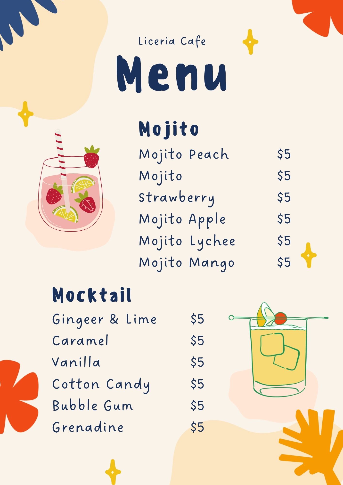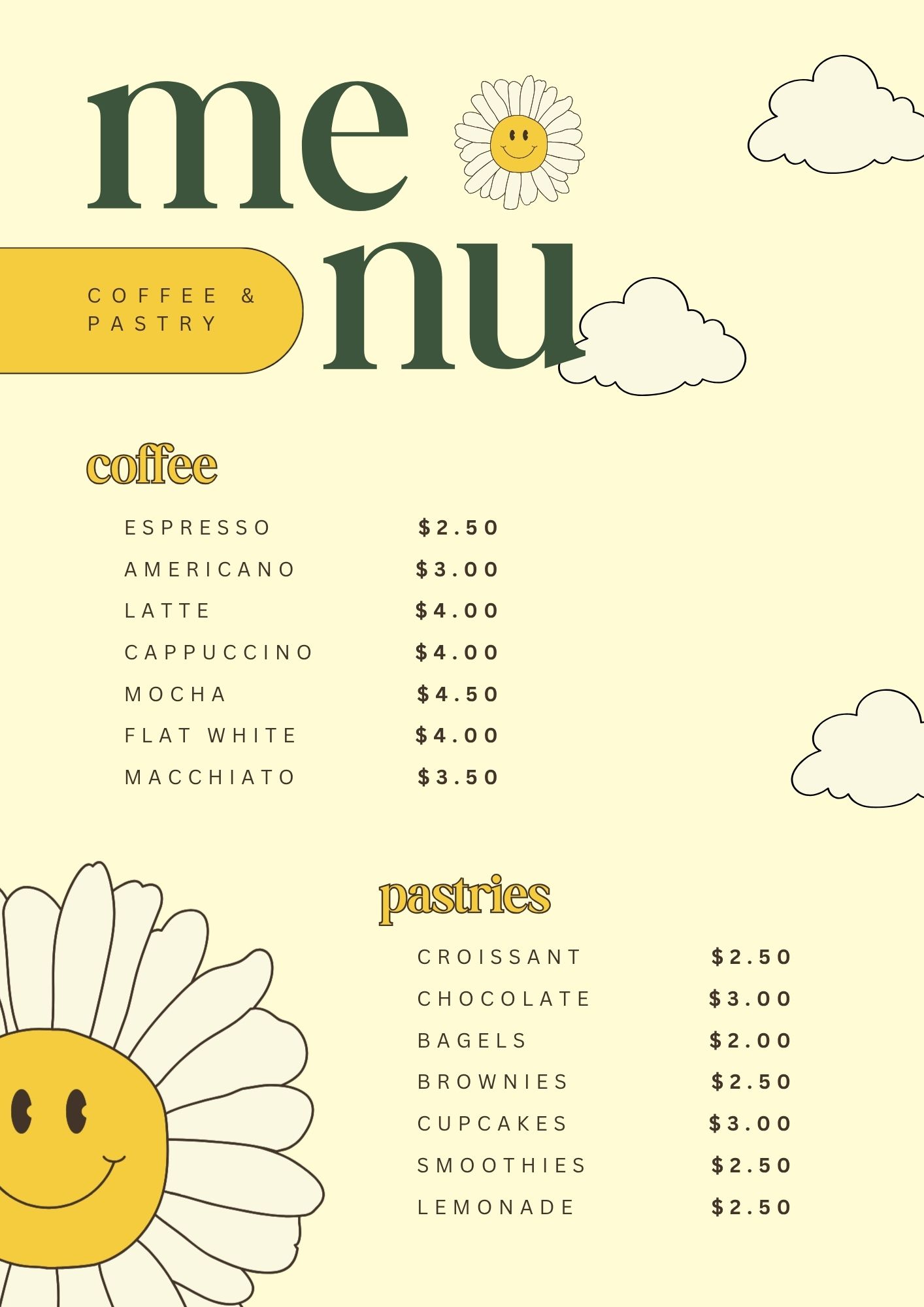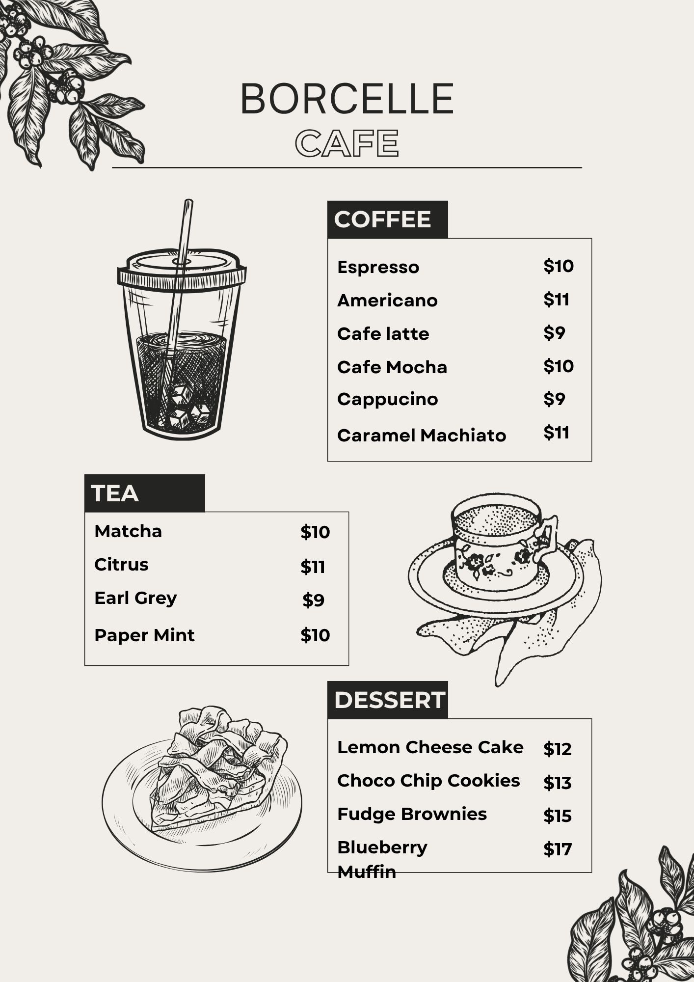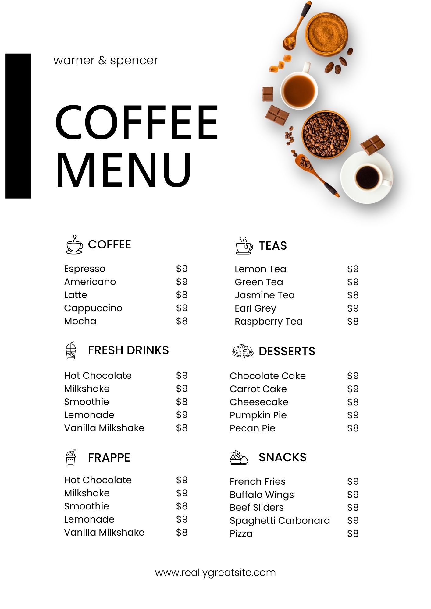 - Bố cục và nội dung rõ ràng: Menu nên được chia thành từng nhóm đồ uống như cà phê, trà, nước ép… với tiêu đề nổi bật. Tên món và giá cần đặt gần nhau, dễ nhìn để khách có thể lựa chọn nhanh mà không phải tìm kiếm lâu.