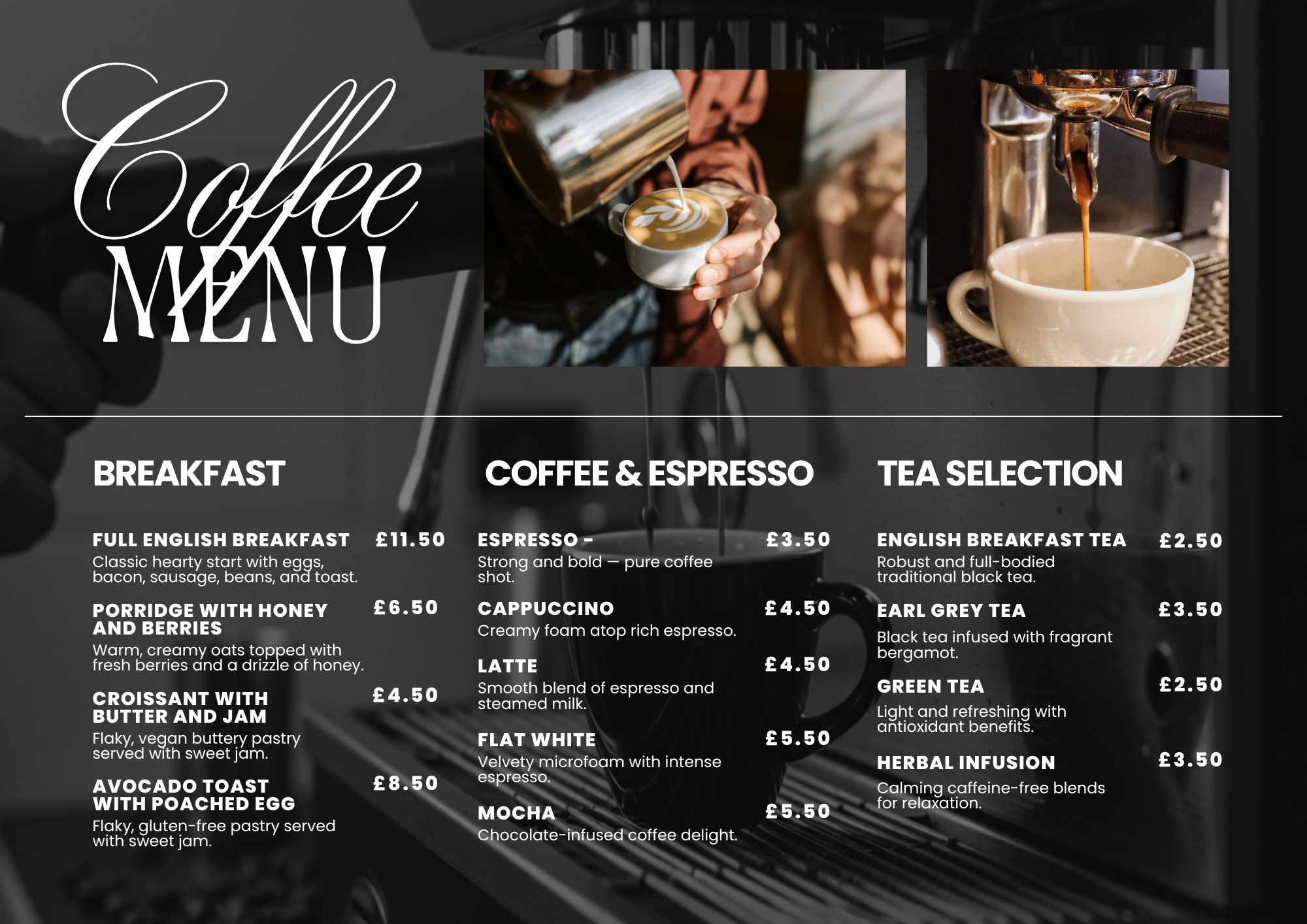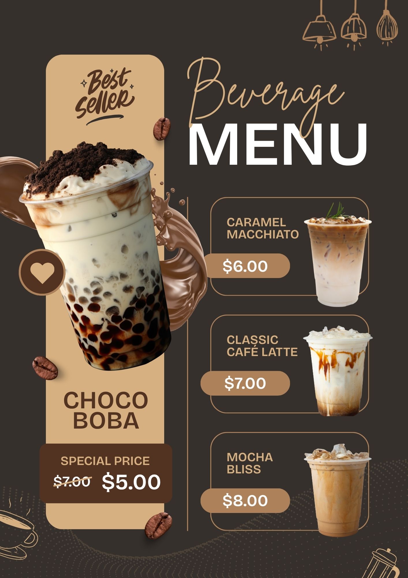 Mang lại cảm giác chuyên nghiệp hơn, có thể trình bày nhiều nhóm món như cà phê, trà, đá xay, bánh hoặc combo khuyến mãi. Hình thức này phù hợp với quán cà phê có nhiều món nhưng vẫn muốn giữ menu gọn gàng, dễ cầm.