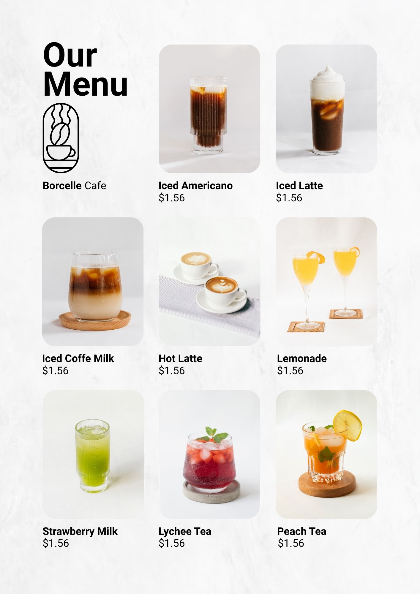 Menu dạng này có thiết kế đơn giản, dễ in, chi phí thấp, thường dùng cho quán cà phê nhỏ, quán take away hoặc quán thay đổi menu thường xuyên. Menu dạng này giúp khách xem nhanh, gọi món nhanh và dễ thay mới khi cần.