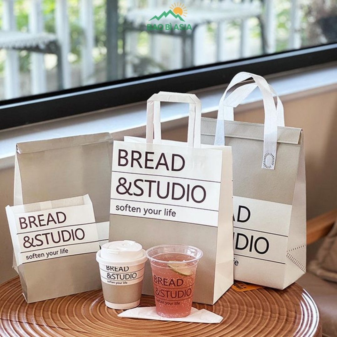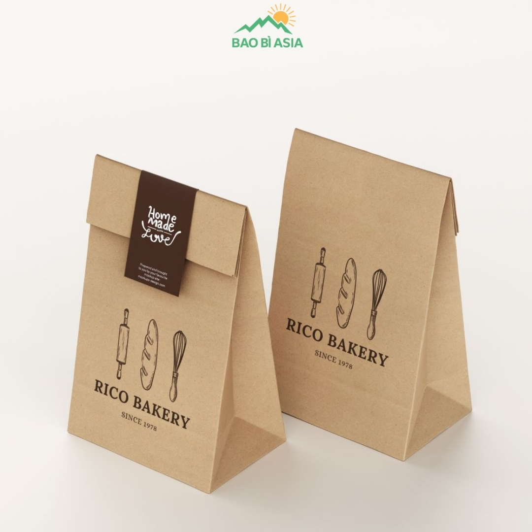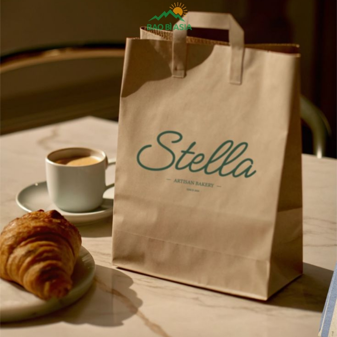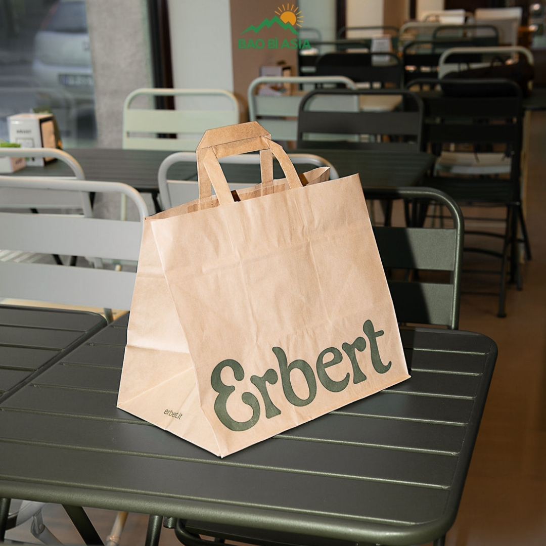 Giấy dày dai, mặt thô, chịu lực tốt. Thích hợp túi đựng thực phẩm, đồ uống hoặc bán lẻ mang đi. Màu logo trên nền kraft nâu sẽ trầm nhưng tạo cảm giác tự nhiên, chắc chắn.