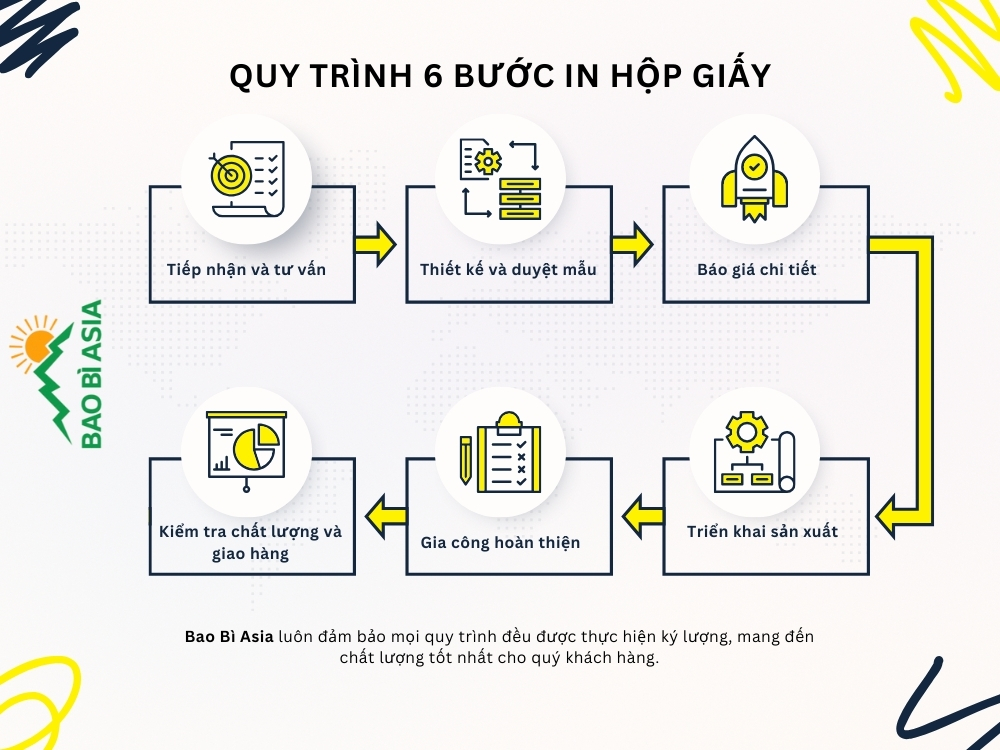 Bao Bì Asia tối ưu thời gian sản xuất bằng quy trình 6 bước tinh gọn, đơn giản từ khâu tư vấn đến giao thành phẩm. Mọi công đoạn thừa được loại bỏ nhằm đảm bảo đúng tiến độ, tối ưu chi phí và giữ chuẩn thiết kế ban đầu cho mỗi một hộp giấy.